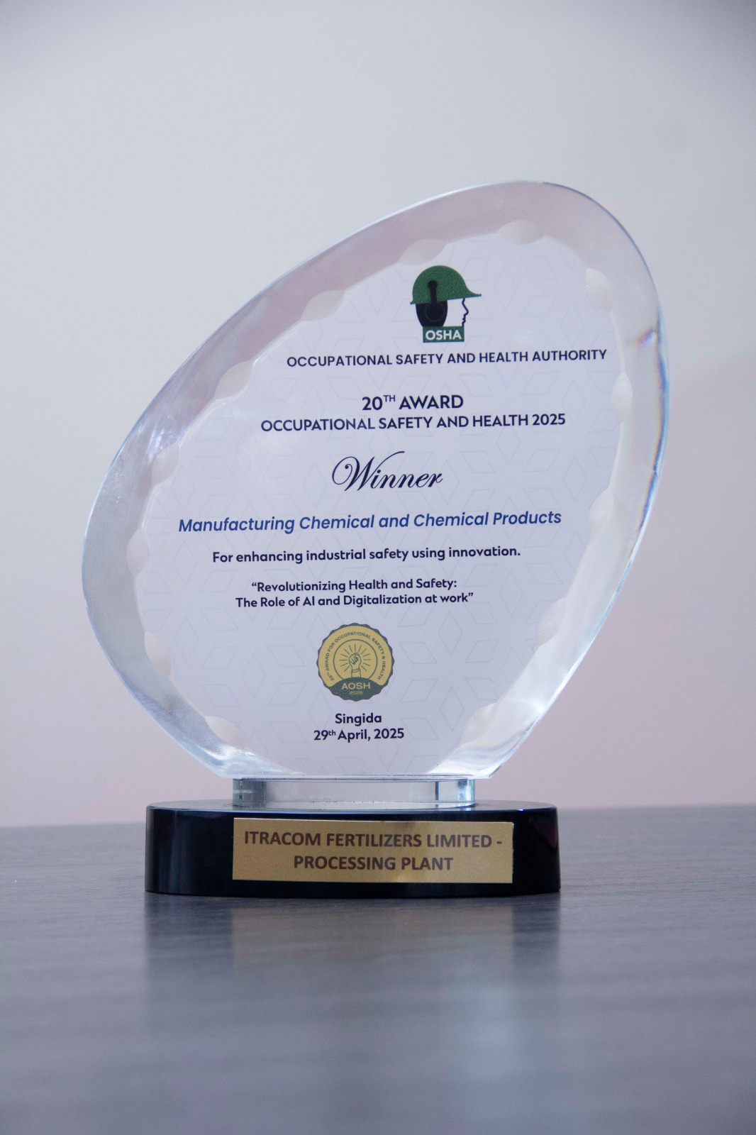 Itracom participated in the Occupational Health and Safety Exhibition organized by the OSHA Institute, held in Singida Region from May 23 to May 30, 2025. The theme of the exhibition was: “The Role of Human Intelligence and Digital Technologies in Strengthening Occupational Health and Safety.” At the event, Itracom competed for the award in the category of Best Manufacturers of Chemical and Non-Chemical Fertilizers, based on compliance with workplace health and safety standards. Among five companies shortlisted for the award, Itracom emerged as the winner and was honored with the award.
